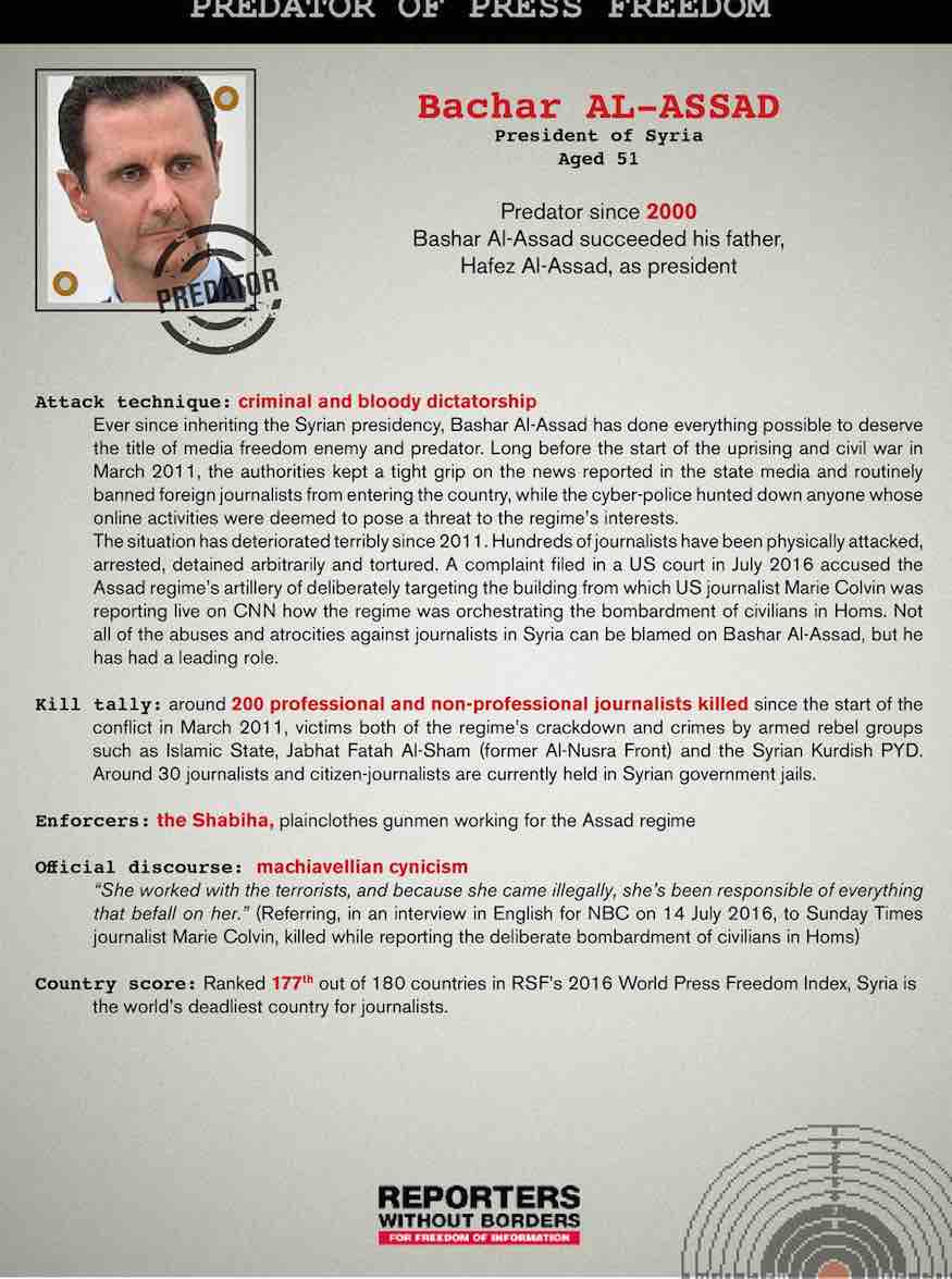 En esta ficha nos ofrecen información sobre sus técnicas de caza favoritas, sus principales objetivos, su discurso oficial o recuento de ejecuciones. Este permiso también da la clasificación del país al que pertenece el depredador en el Índice Mundial de Libertad de Prensa de RSF. La lista recopila los nombres de los personajes que más se han distinguido en el último año.