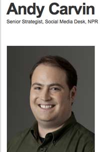 Esta no es una postura que le cueste adoptar a , (Andycarvin.com, @acarvin en Twitter), un periodista que defiende con su ejemplo la colaboración entre periodistas profesionales y ciudadanos tal y como ya demostró durante las revueltas de la Primavera Árabe, usando su cuenta en Twitter para verificar la información que le llegaba y así ofrecer una visión diferente de los hechos contandos con testimonios fundamentales desde las principales ciudades afectadas, especialmente Egipto y Libia, no en vano ha sido bautizado como «el periodista que tuitea revoluciones».