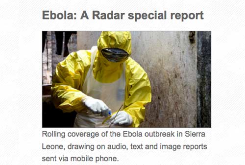 Tenemos un proyecto en Sierra Leona que ha recibido mucha atención porque lo centramos en el Ébola, desde que estalló el año pasado. Tenemos un grupo de reporteros a lo largo de Sierra Leona, que nos proveen de actualizaciones desde la zona y lo que sucede en el proceso de intentar controlar el Ébola.