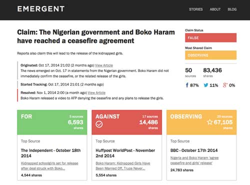Emergent es un rastreador de noticias creado para luchar contra la propagación de rumores. Se trata de una iniciativa basada en el periodismo de datos que combina el trabajo de máquinas y personas con el fin de identificar y desmentir posibles bulos, luchando así contra la desinformación.
