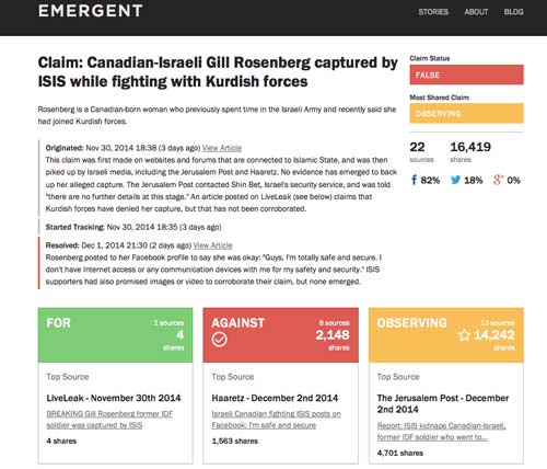 En la actualidad podemos ver algunos de los rumores que Emergent ha investigado utilizando análisis de datos y visualizaciones, como el supuesto secuestro por grupos yihadistas de la joven isrraelí-canadiense Gill Rosenberg, de 31 años. En poco más de 24 horas surgieron las primeras informaciones relacionadas con su secuestro a manos de ISIS. Según las investigaciones realizadas no han encontrado informes que demuestren el secuestro de la joven, una cuestión que señalan, debe ser tenida en cuenta para posteriores reclamaciones utilizadas por partidarios de ISIS y otros grupos similares que pueden utilizar este tipo de rumores para hacer propaganda de sus actuaciones.