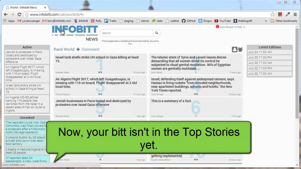 Un pequeño grupo de beta-testers han estado usando durante varios meses Infobitt y ahora,  inician una segunda fase en la que puedes registrarte para obtener una cuenta sin invitación y ver su funcionamiento. El sitio está abierto a cualquier persona que desee inscribirse y comprometerse a añadir una noticia en una sola frase y una URL. En la web veremos una serie de titulares, o frases cortas, que serán contrastadas por los editores del proyecto que enlazan al contenido original de donde se ha sacado esa nota. Para contenidos más ámplios, aparecerán varias frases a modo de titular que forman una unidad de información que Sanger llama Bitt, tal y como  señala en el vídeo explicativo creado para mostrar su funcionamiento: