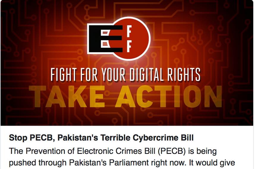 La Ley de Delitos Cibernéticos, más conocida como el PECB, (Prevention of Electronic Crimes Bill),  está siendo impulsada a través del Parlamento de Pakistán. Numerosas organizaciones de defensa de los derechos humanos como Human Rights Watches o Electronic Frontier Fundation, (@EFF), denuncian las graves consecuencias que la aprobación de esta ley podría tener para la libertad de expresión. Según señalan EFF: