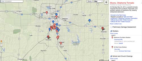 Los mapas de información ciudadana, como el puesto en marcha por el equipo de Respuesta a la Crisis de Google, puede ser de gran interés para los afectados. En este mapa encontramos todo tipo de información publicada por los residentes de Moore y alrededores.