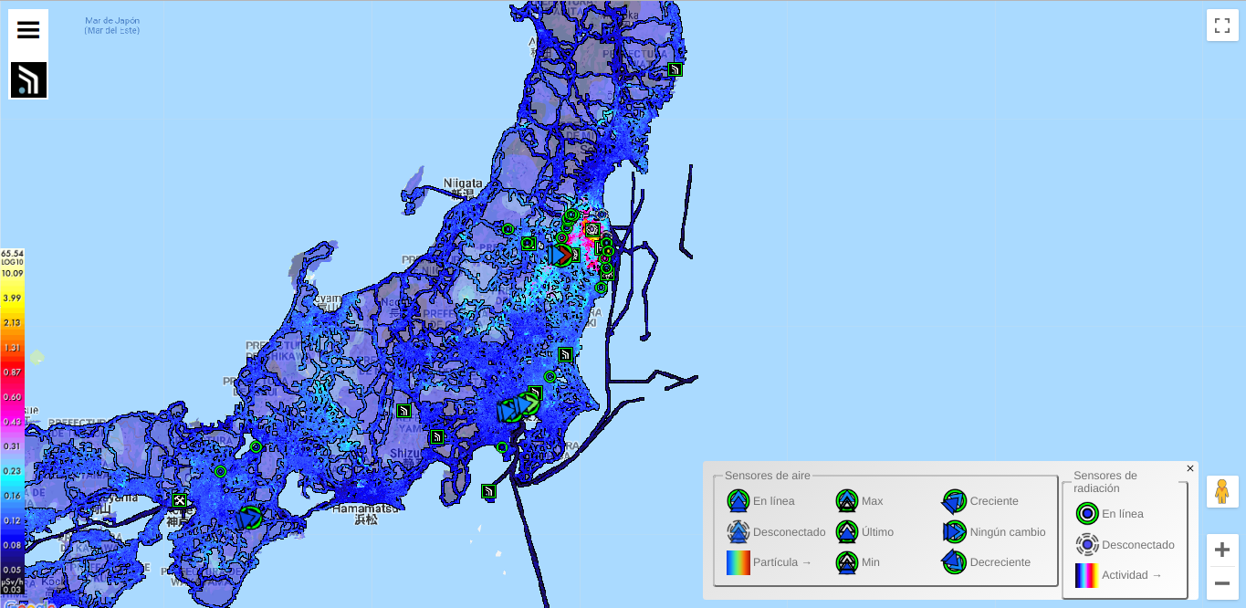 En su web también puedes consultar un mapa de información geolocalizada en donde publican los niveles de radiación del país en tiempo real. El mapa indica aquellos sensores de radiación o de calidad del aire que están activos, si los niveles van en ascenso o en descenso o si no se han producido cambios, entre otros datos.
